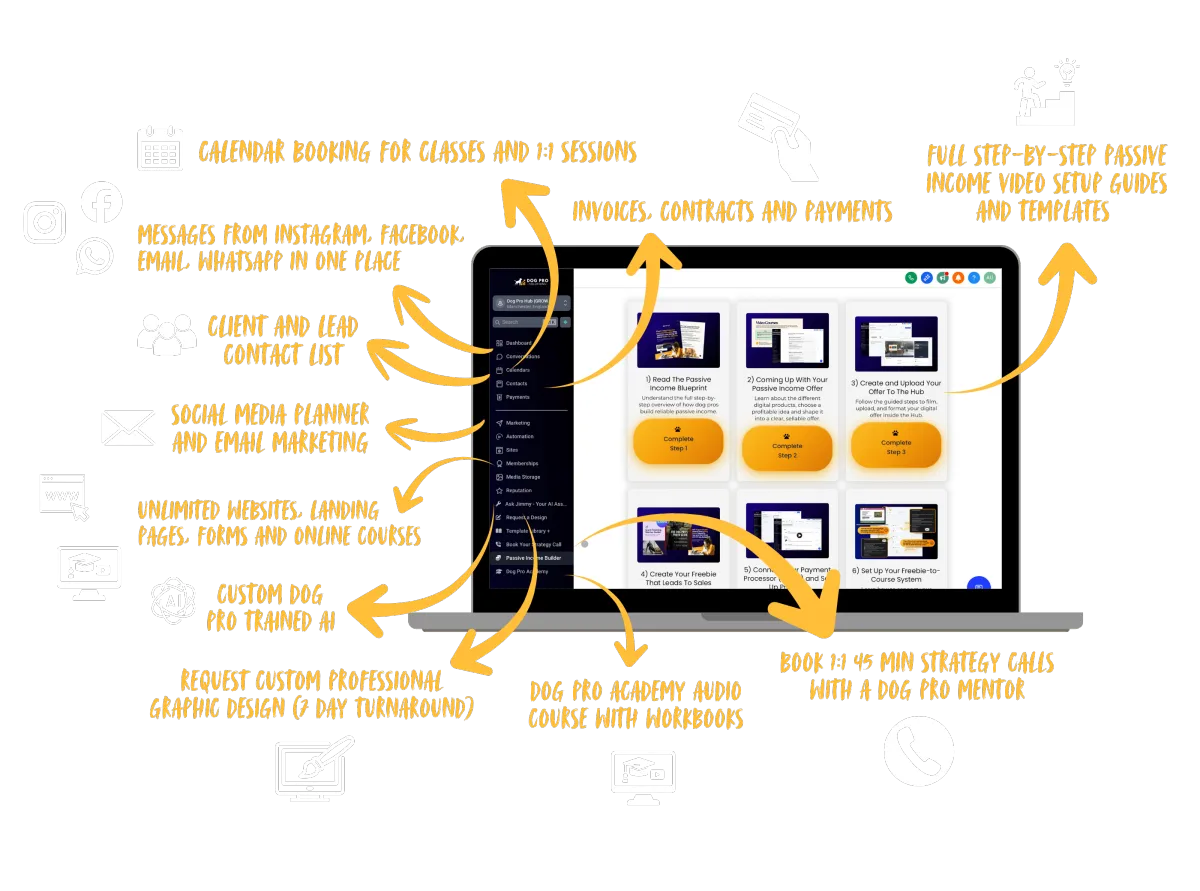 Dog Pro Hub Tools (bookings, courses, client management, email & SMS marketing, website and funnel builder, social media planner, automations, invoicing and contracts.)